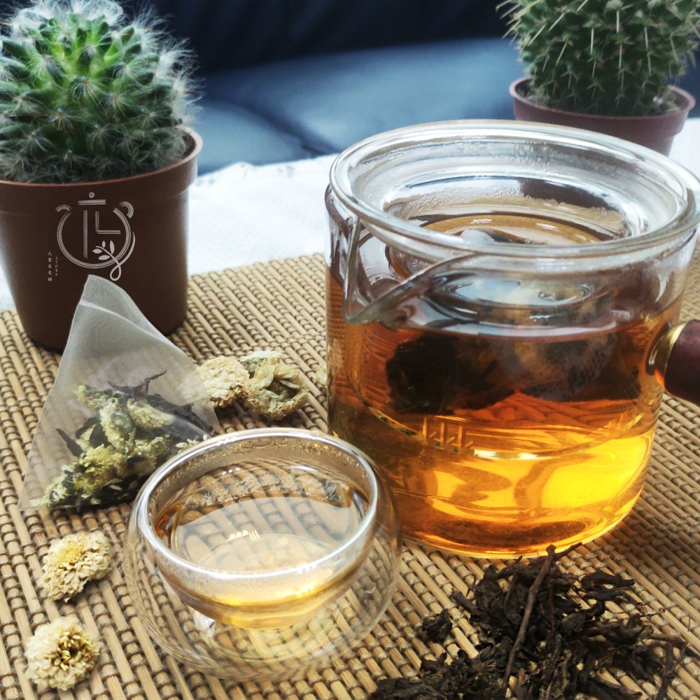 苗栗杭菊結合雲南普洱,花香清甜、茶湯厚實,甘潤不澀。