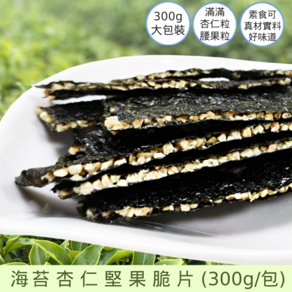 ✅ 產品資訊: • 成分:麥芽糖、杏仁、海苔、腰果、鹽、酵母抽出物、胡椒粉 • 淨重:300g/包(加厚脆片、超飽足) 全素可食 • 保存小提醒:開封後請密封保存,避免受潮影響口感! ⚠ 過敏原資訊: 本產品含有:堅果類(杏仁、腰果)、芝麻、含麩質穀物、大豆等製品,對相關食材過敏者請留意